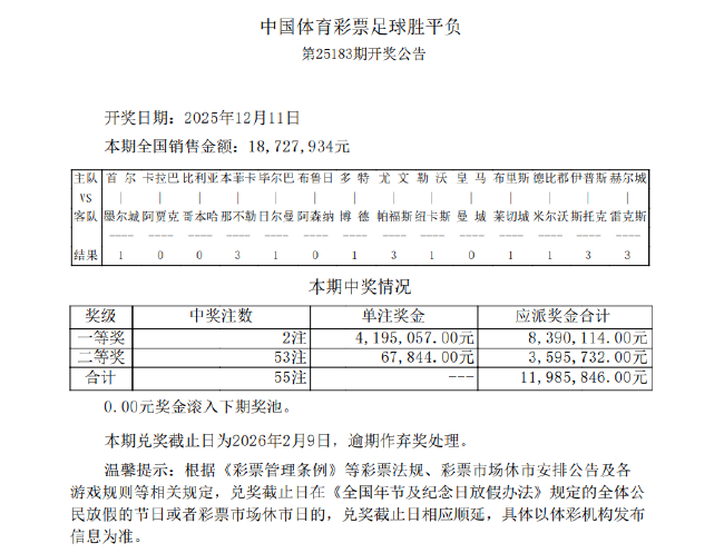 北京时分12月11日,足彩第25183期开奖恶果揭晓。本期十四场头奖开2注,单注奖金4,195,057元;二等奖开出53注,单注奖金67,844元;任选九场开出254注,单注奖金40,754元。本期赢输彩销量为18,727,934元,任九投注总数为16,174,526元。